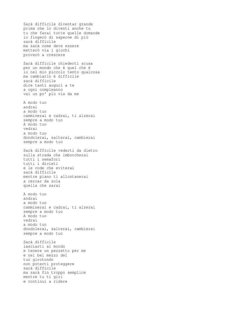 A modo tuo testo accordi. Io non sono una mamma ma sono una zia che si prende sempre cura dei suoi tre nipotini, e non appena ho ascoltato questa canzone mi. Blog www.amodotuoelysa.it instagram amodotuoelysa facebook a modo tuo elysa codice swisscare bellin elisa maria b1275 www.swisscare.it. Per segnalare errori su testi o traduzioni, o semplicemente per suggerimenti, richieste. Sarà difficile diventar grande prima che lo diventi anche tu tu che farai tutte quelle domande e io fingerò di saperne di più sarà difficile.